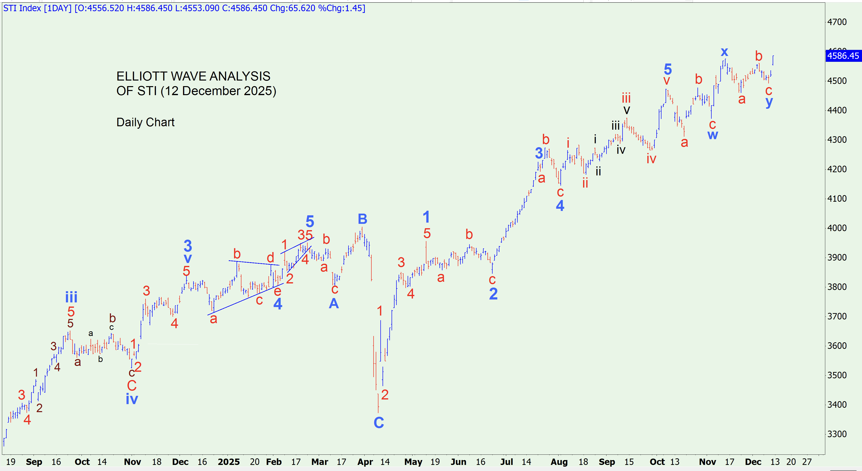 The corrective wave y(blue) as shown in the chart above has completed in a hurry and a new impulse wave started yesterday. Today it gapped up, confirming the strong push upwards, as the STI started forming Wave 1 (blue). The uptrend will continue next week.
