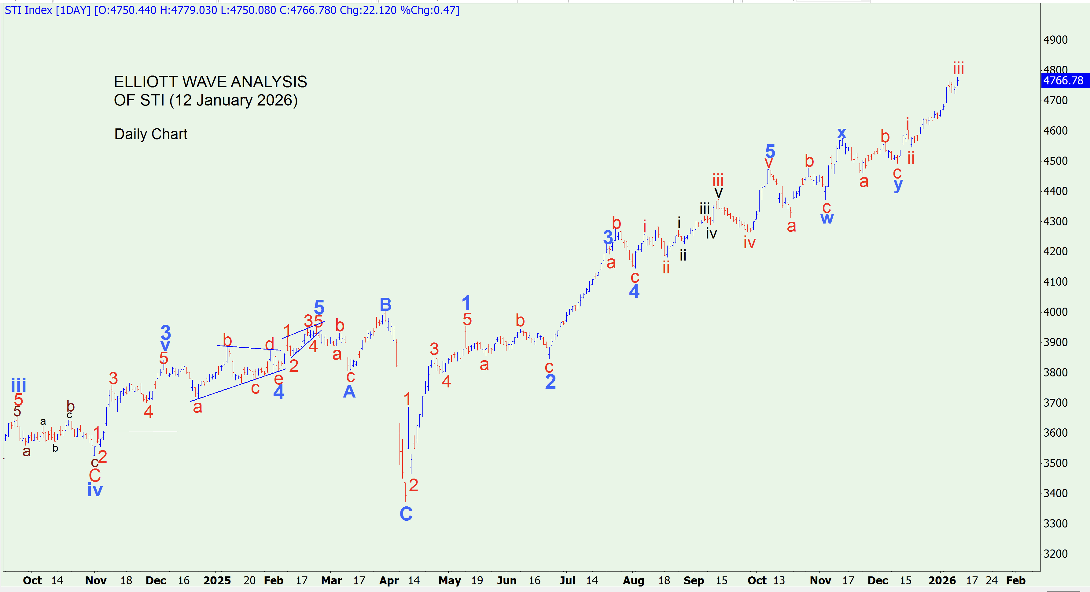 The STI is continuing upwards with Subwave iii (red). It should end soon, to be followed by corrective Subwave iv (red) declining, and motive Subwave v (red) going upwards.