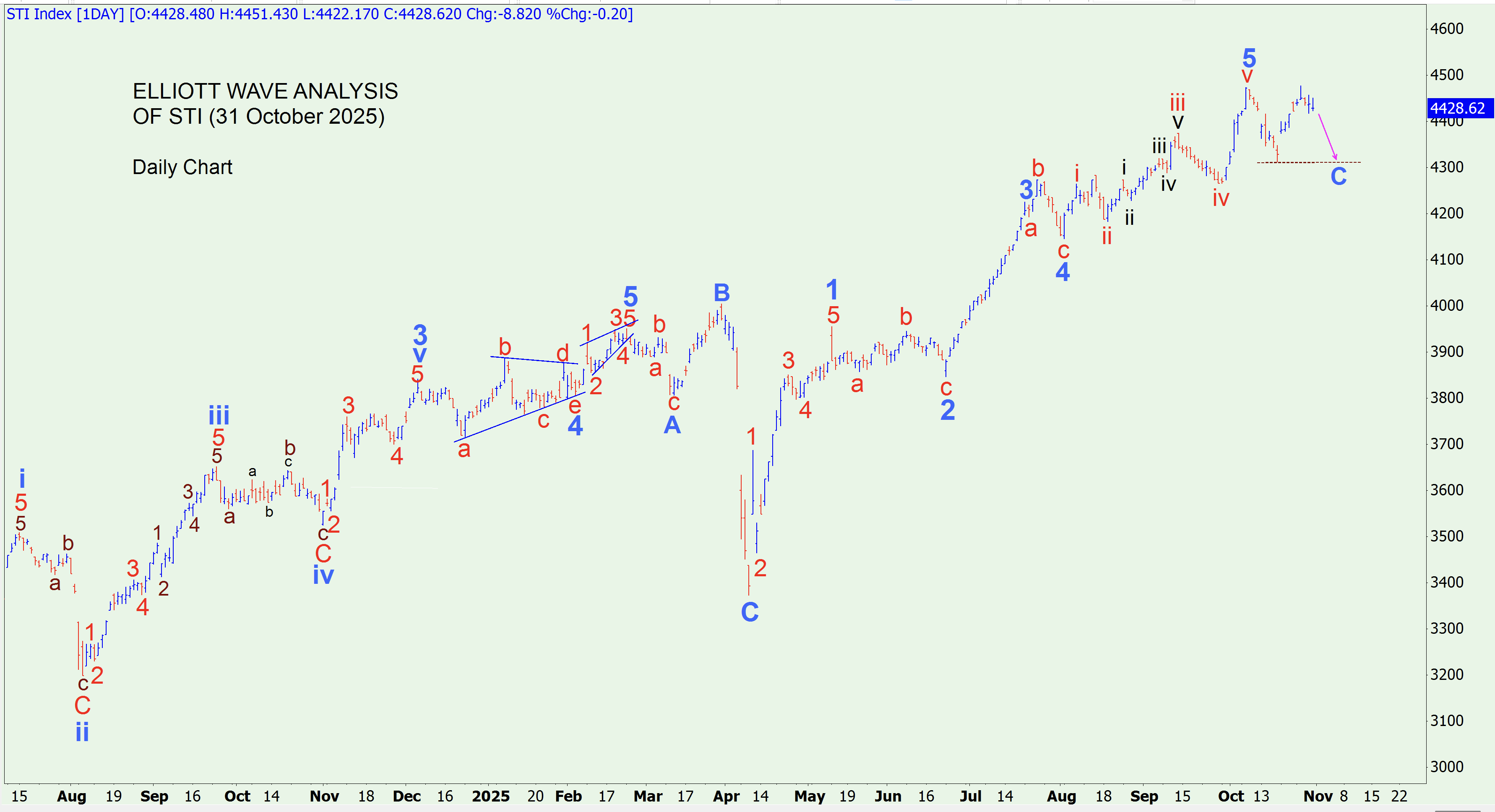 Since my supplement on 29 October the STI has declined further, as expected. Next week it should decline some more. Perhaps the week after it should find support at the dotted line at 4311.65. We have to wait and see.